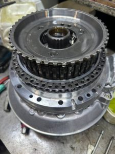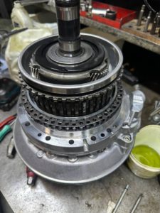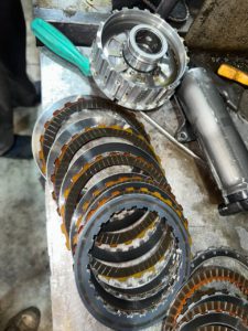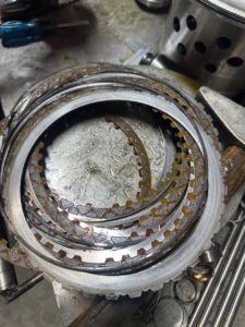 Разбираем АКПП — все пакеты сцеплений сгоревшие. Скорее всего, длительное время коробка работала с недостаточным уровнем масла: фрикционы перегревались и выгорали.